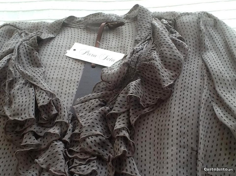 Camisa / túnica de manga comprida com folho à frente,de seda natural giríssima,tamanho pequeno,Made in Italy
