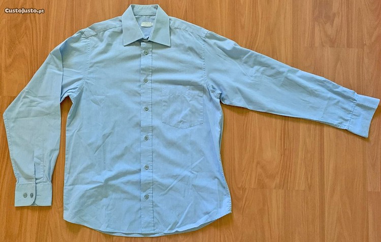 É de boa qualidade, muito leve e fresca. De cor completamente azul claro, ligeiramente mesclado e não possui quaisquer estampagem. Com corte clássico, abotoa à frente e nos punhos, com botão duplo, de cor azul. Possui um bolso ao peito do lado esquerdo. Tem um estilo muito clássico e prático, é muito confortável, combinando muito bem com qualquer tipo de estilo e ocasião, sejam elas mais formais ou mais casuais e descontraídas.