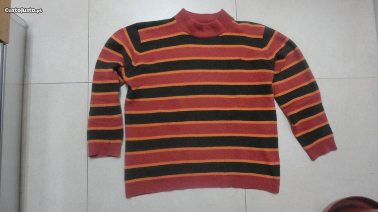 Camisola de senhora cor bordeaux, laranja e cinza, tamanho M. Pura lã virgem.