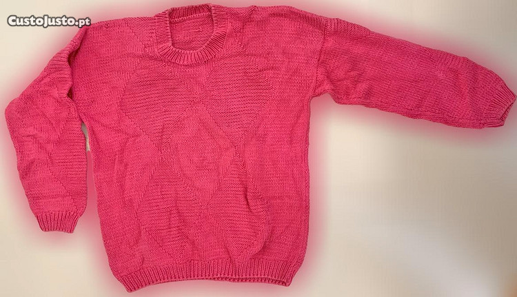 É em algodão de excelente qualidade e é feita à mão por artesã, portanto, é um modelo único e exclusivo. É de cor completamente rosa forte e não possui qualquer estampado, no entanto, a malha ela própria produz efeitos no tricotar, como que desenha uma espécie de losangos, no seu todo. Possui mangas compridas, ombros ligeiramente descaídos, decote redondo, que, tal como a cintura e as mangas terminam em malha elástica, para melhor ajuste ao corpo. É muito prática, moderna, elegante e confortável, combinando muito bem com diferentes tipos de estilos, situações e ocasiões, sejam mais formais, casuais, descontraídas, de lazer ou desportivas, dependendo das peças com que combina. Esta camisola foi feita à mão por artesão de Cascais, é por isso um modelo único e exclusivo, não há outra igual.