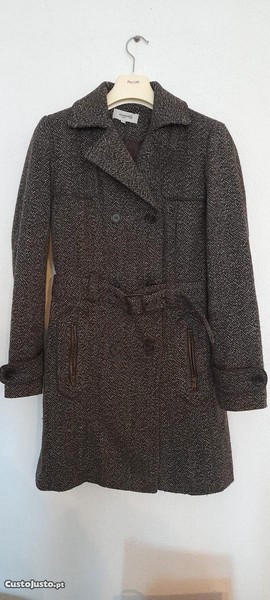 Casaco de inverno, castanho mesclado, com cinto e bolsos laterais.