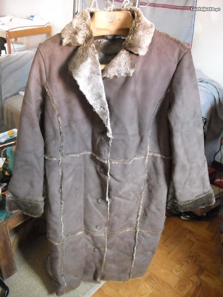 Casaco comprido tipo pele e com pelo por dentro, muito quentinho e muito elegante.