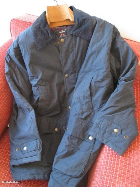 Com quatro bolsos à frente e um dentro. Gola de bombazina, forro quente e com a particularidade de ser leve. Fecho éclair de alto a abaixo e botões.
