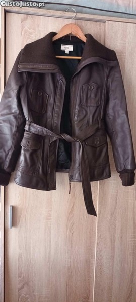 Casaco de senhora tipo pele, com cinto, cor castanha, todo forrado, com punhos e gola em malha com fecho e botões, como novo, tamanho M/L.