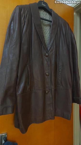 Casaco em pele genuína, cor bordeaux escuro com forro em cetim e tamanho L. ÚLTIMOS DIAS.