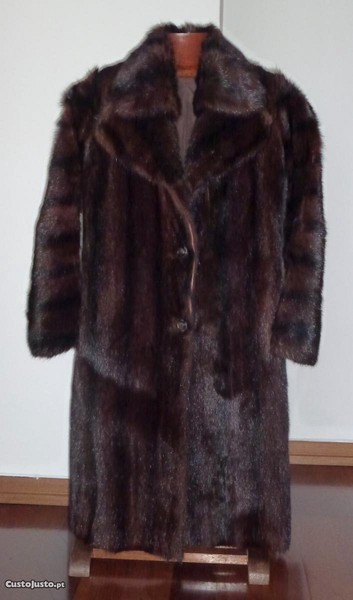 Casaco em pele de VISON "têtê négre" (diamante negro), em lombos de vison, comprido, linha clássica com gola e banda: Anos 40/50.