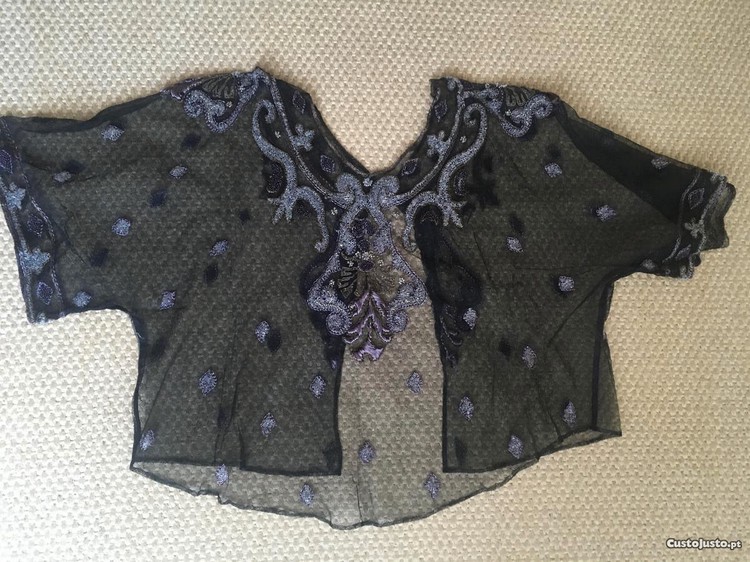Bolero / casaquinha em tule preto aberto atrás nas costas,bordado à mão,com manga curta