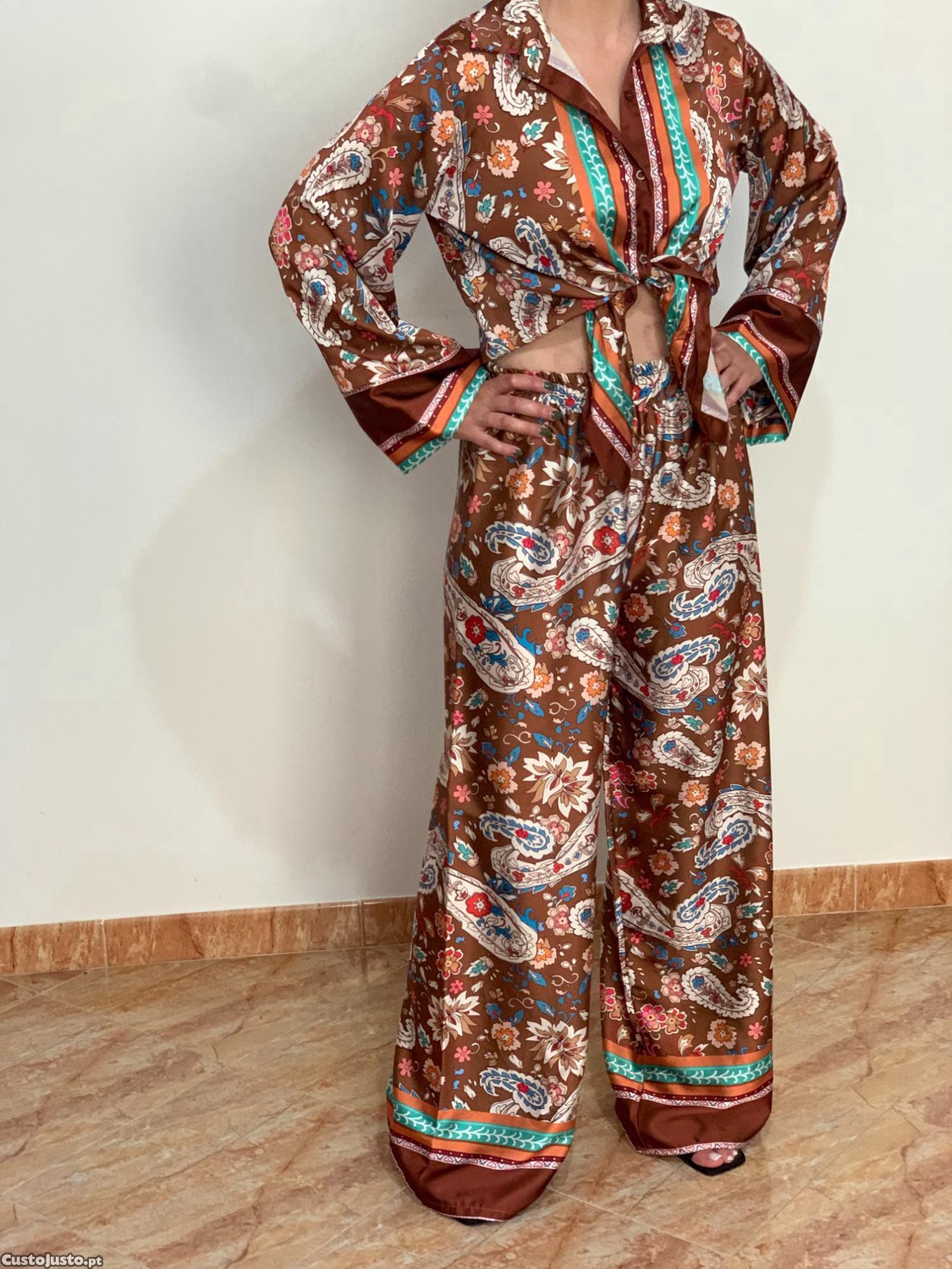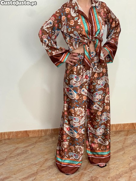 Preço: 14 €Conjunto Acetinado Elegante Camisola + Calças Pantalonas - tamanho único