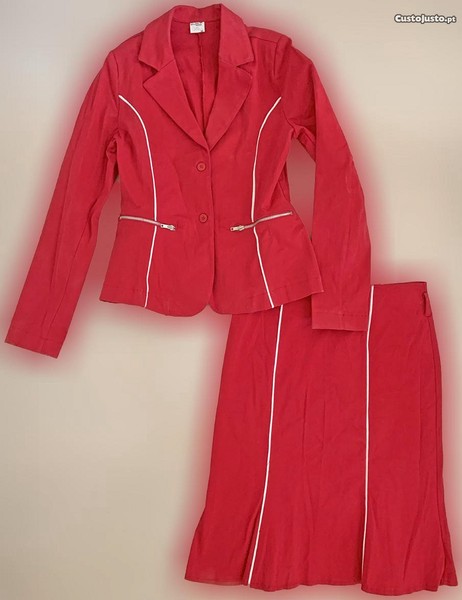 De boa qualidade, é da reconhecida marca Molera Moda, ORIGINAL. A saia é de cor base completamente vermelho, não possui qualquer tipo de estampado, no entanto, possui duas aplicações à frente e mais duas atrás em branco, no sentido vertical, com que um rebordo. Tem um corte invulgar, sem cintura, com corte quase direito, mas com pequenos machos em baixo, abrindo. Fecha atrás com fecho éclair escondido, no mesmo tom. É uma saia com um comprimento abaixo do joelho. O casaco, tal como a saia, é de cor base completamente vermelho, não possui qualquer tipo de estampado, no entanto, possui duas aplicações à frente em branco, no sentido vertical, com que um rebordo. A parte de trás não possui qualquer aplicação. De manga comprida e decote em V e gola recortada, aperta à frente com dois botões, no mesmo tom. Possui dois bolsos à frente que fecham com fecho éclair e o corte é ao estilo fato, mas em baixo abre um pouco, à semelhança da saia.