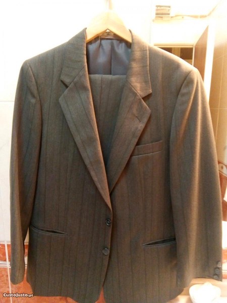 Fato composto de calças e casaco do estilista alemão Egon Von FurStenberg. Cor cinzenta com listas finas. 45% lã, 55% poliester. Bainha feita. Tamanho 50, equivalente a um 48. Usado uma vez.