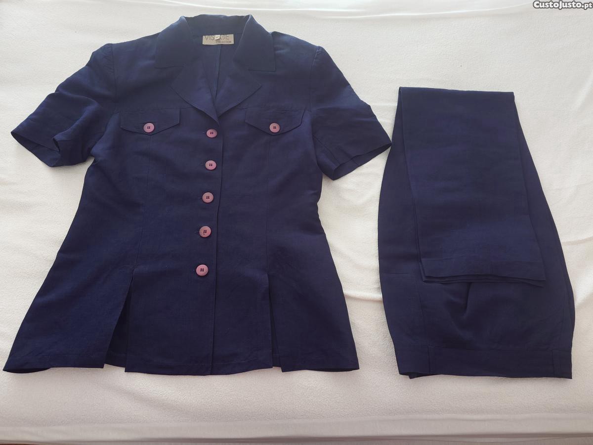 Vendo fato de calça e casaco de senhora de manga curta em linho de cor azul escuro.