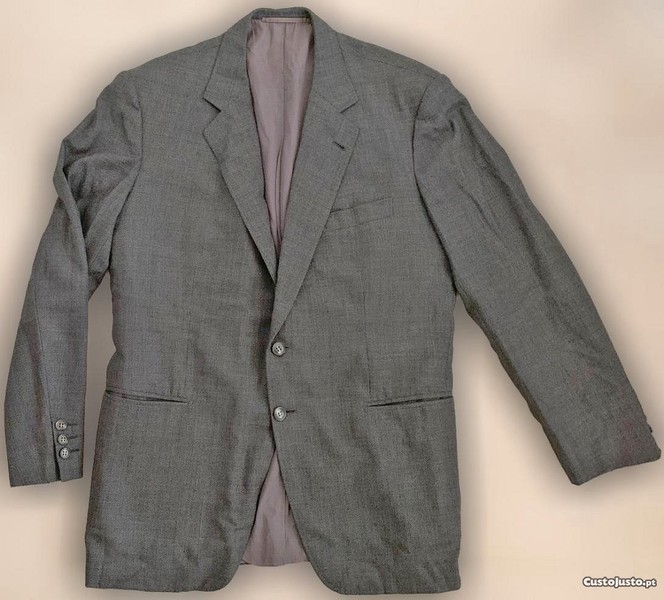 É de excelente qualidade, em tecido muito firme, quente e consistente. Da reconhecida e centenária alfaiataria Nunes Corrêa, ORIGINAL, é de cor um mini-ponteado preto e branco, conferindo-lhe um tom um mesclado cinzento médio. Tem um corte clássico, mas actual. O casaco abotoa à frente com dois botões no mesmo tom mesclado, O colarinho de recorte duplo e decote em V longo, possui uma casa no lado esquerdo inferior. Na cintura, tem um corte ligeiramente arredondado, mas fechado para o abotoar e possui um forro em cetim, no mesmo tom. No exterior, possui um bolso ao peito, do lado esquerdo e dois bolsos de chapa ao nível da cintura, ambos com pala e com bolso duplo dentro. Já no interior, possui dois bolsos ao peito que fecham com botão, um de cada lado, sendo que do lado direito possui um bolso extra, mais pequeno e do lado esquerdo possui adicionalmente mais dois pequenos bolsos, mas possui ainda mais um bolso grande ao nível da cintura. As mangas são compridas, terminando com botões triplos e as costas são lisas.