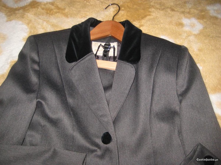 Vendo fato saia-casaco senhora (n36) COMO NOVO (usado uma única vez para jantar), cor cinzento escuro, com gola, botões e palas na zona de bolsos em veludo preto. Confeção de boutique , de muito boa qualidade.