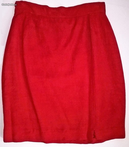 De cor vermelho vivo, tem um corte clássico, com cintura, é curta e abotoa atrás com botão forrado com o mesmo tecido e com fecho éclair. É em tecido de elevada qualidade com 22% de linho e é leve, possuindo ainda um forro em cetim do mesmo tom da saia. Possui um apequena racha à frente, sobre a perna esquerda, o que lhe confere um toque de originalidade e irreverência.