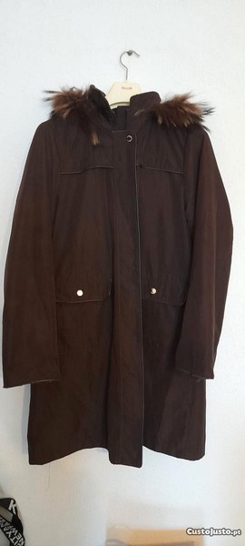 Parka castanha com pêlo verdadeiro no capuz e interior e dois bolsos laterais com pala.