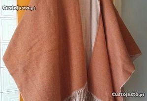 Poncho com franjas em tecido macio e quente cor castanho tamanho L - Bom estado