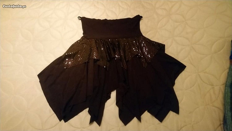 Saia rodada e assimétrica em licra castanha com brilhos.