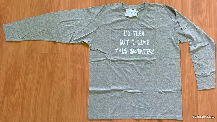 É de excelente qualidade, em tecido muito leve. De cor completamente cinza médio mesclado, na frente possui uma frase humorística Id flex, but I like this sweater. De corte direito, tem manga comprida e decote redondo. É muito prática, moderna e é muito confortável, combinando muito bem com diferentes tipos de estilos e ocasiões, mais casuais, descontraídas ou desportivas, dependendo das peças com que combina. É completamente nova, possui a etiqueta, é uma peça única e exclusiva, não há outra igual.
