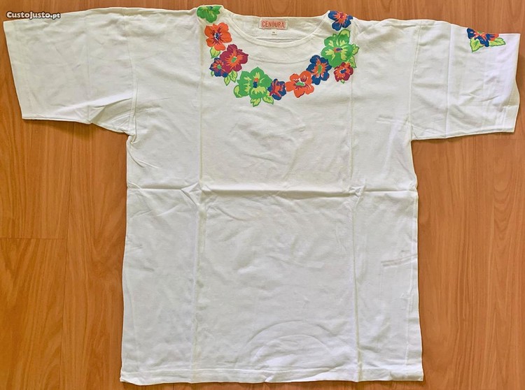 É de excelente qualidade, em tecido muito leve. De cor completamente branca, na frente, em redor do pescoço, possui uma espécie de um colar de flores, em tons de verde, laranja e azul. De corte direito, tem manga curtas e decote redondo. Na manga possui novamente uma flor e nas costas, em baixo do lado direito junto à cintura tem mais uma flor e a inscrição Taiti paradise islands É muito prática, moderna e é muito confortável, combinando muito bem com diferentes tipos de estilos e ocasiões, mais casuais, descontraídas ou desportivas, dependendo das peças com que combina. É completamente nova, mas não possui etiqueta.