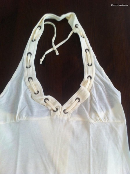 Top com alça ao pescoço, a fita passa por meio de ilhoses.