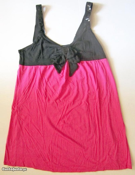 É muito leve, prático, moderno e irreverente. De marca francesa, é de cor base rosa forte, sendo que o topo é todo numa faixa larga em preto e não possui qualquer estampado. É de alças e tem um com corte a abrir, conferindo-lhe muita leveza. As alças são todas bordadas a lantejoulas pretas, bem como o nó do laço que tem ao centro do peito, que o tornam muito original e invulgar. É confortável e muito elegante, combinando muito bem com múltiplos tipos de estilos e ocasiões, sejam mais formais ou mais casuais e descontraídas, dependendo das peças com que combina.