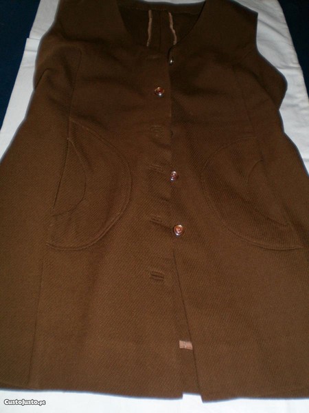 Óptima túnica de cor castanha, estado impecável, toda debruada nas costuras, confecionada por medida nos anos 60. Cintada e em vazé.