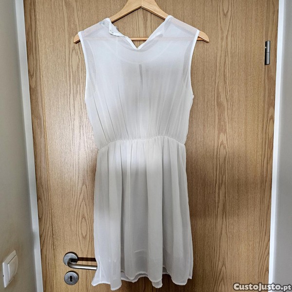 Vestido branco da marca Red Queen, estilo manga à cava, que dá quase até aos joelhos. Está praticamente novo, nunca foi usado. Bonito para usar no Verão em diversas ocasiões. Com ligeiro decote nas costas. Tem folho no interior, por isso não é transparente. Tanto veste M como L. Material: 100% poliéster.