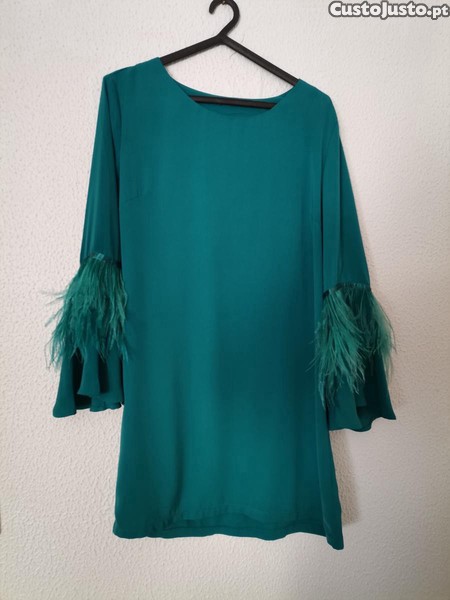 Vestido azul turquesa (esverdeado) com penas nas mangas