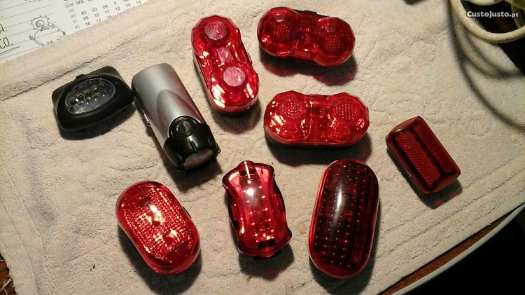 8 lâmpadas de Led para ciclismo com muita visibilidade ou outros fins.Luzes brancas, vermelhas fixas ou intermitentes com botão comutador levam pilhas AAA, cada 3 euros pelo conjunto faço 20.