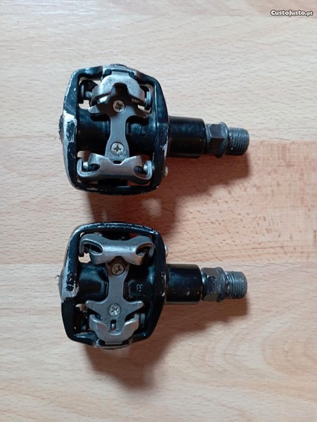 Pedais de encaixe para BTT, marca EVO. Os pedais não têm afinação para aperto/alargar ao sapato, por não terem parafuso (parafuso perdido).