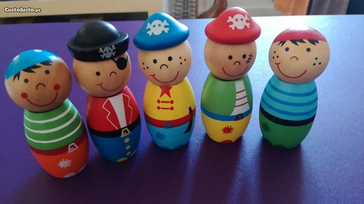 Bonecos de madeira para jogar bowling composto por três piratas, dois marinheiros e uma bola.