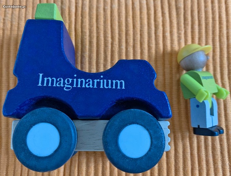 Pequeno carro 100% em madeira da reconhecida marca Imaginarium e da colecção Woody Click, completamente em azul escuro com um apontamento no topo a verde alface e as rodas a preto e branco. Possui uma cavidade central onde encaixa um pequeno bonequinho articulado, com boné amarelo, mexe os braços, pernas e a cabeça. As cores e os sons estimulam a memória da criança, a perceção de acção / reacção e a associação a situações reais. Todo o brinquedo é em linhas curvas para evitar que a criança se magoe. É original e muito estimulante a vários níveis sensoriais para uma criança pequena. É um elemento muito útil numa aprendizagem divertida, mais célere e consistente. Além da sua evidente função e dado a sua raridade, este brinquedo é também uma peça de coleccionismo com valor acrescentado. Indicado para criança dos 3 aos 8 anos.