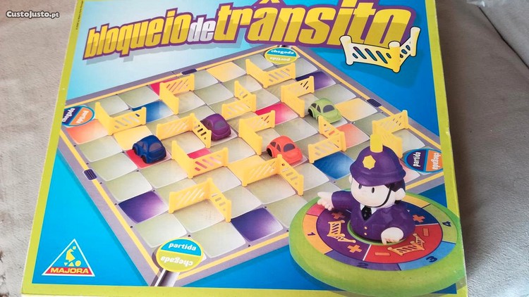Jogo de tabuleiro da Majora - Bloqueio de Trânsito é um divertido jogo para crianças acima de 3 anos de idade para até 4 jogadores cujo objectivo é conduzir um carro contornando as barreiras das ruas até chegar à casa de chegada. Cada jogador escolhe o carro e pressiona a cabeça do policia para fazê-lo girar e este indicar o número de casas que deve avançar (ver fotografias). O policia também ordena que se coloque ou retire uma barreira para bloquear o caminho dos adversários, ou tornar livre o seu próprio caminho. Ganha o jogador que chegar primeiro à casa de chegada.