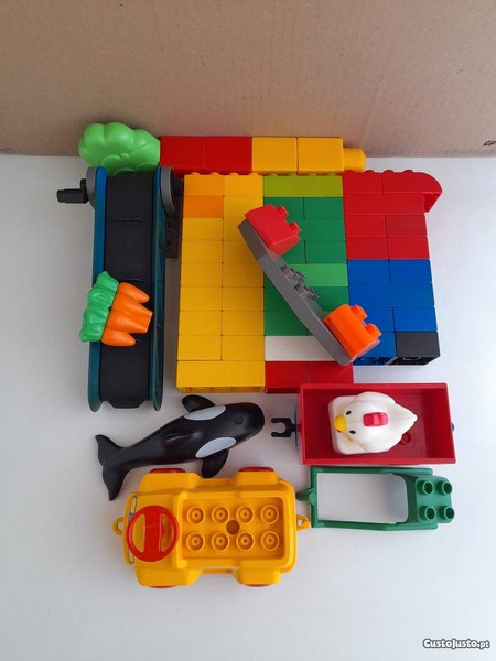 Vendo lote composto por várias peças de formatos e cores diferentes mais 2 carrinhos e alguns animais conforme fotografia.
