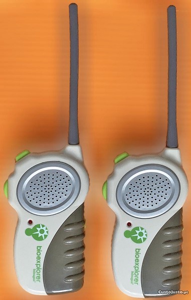 Par, com longo alcance, da reconhecida marca Imaginarium, em tons cru e cinza escuro. Indicado para crianças a partir dos 3 anos, estimula a criança a falar e a apreender regras de segurança e comunicação, mas também é extremamente útil para se manter em contacto com a criança, em especial se esta estiver fora do alcance visual, sendo um valioso elemento de segurança. Têm regulador de volume e pinça na parte de trás para facilmente se prenderem à mochila, calças, casaco, etc. Em plástico rígido com linhas curvas para evitar que a criança se magoe e funcionam com 2 pilhas AA. São um muito estimulantes para uma criança a vários níveis. É também muito útil numa aprendizagem divertida, mais célere e consistente.