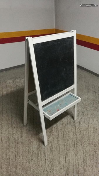 Quadro cavalete de ardósia para criança em bom estado com algum uso (com pequeno dano na parte de trás), ideal para brincadeiras, exercícios e para estudos com giz no quarto ou sala.