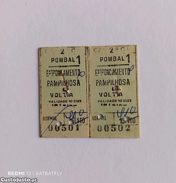 Preço: 9 €2 bilhetes de comboio de 2a CL da CP, Pombal 1 - Entroncamento - Pampilhosa e VOLTA inteiro