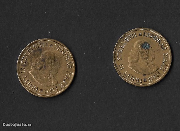 2 moedas circuladas de 1céntimo. África do Sul 1961 e 62, latão, peso 9,42gr, diam. 31mm e espessura 1,88 mm. As moedas representadas serão as enviadas.