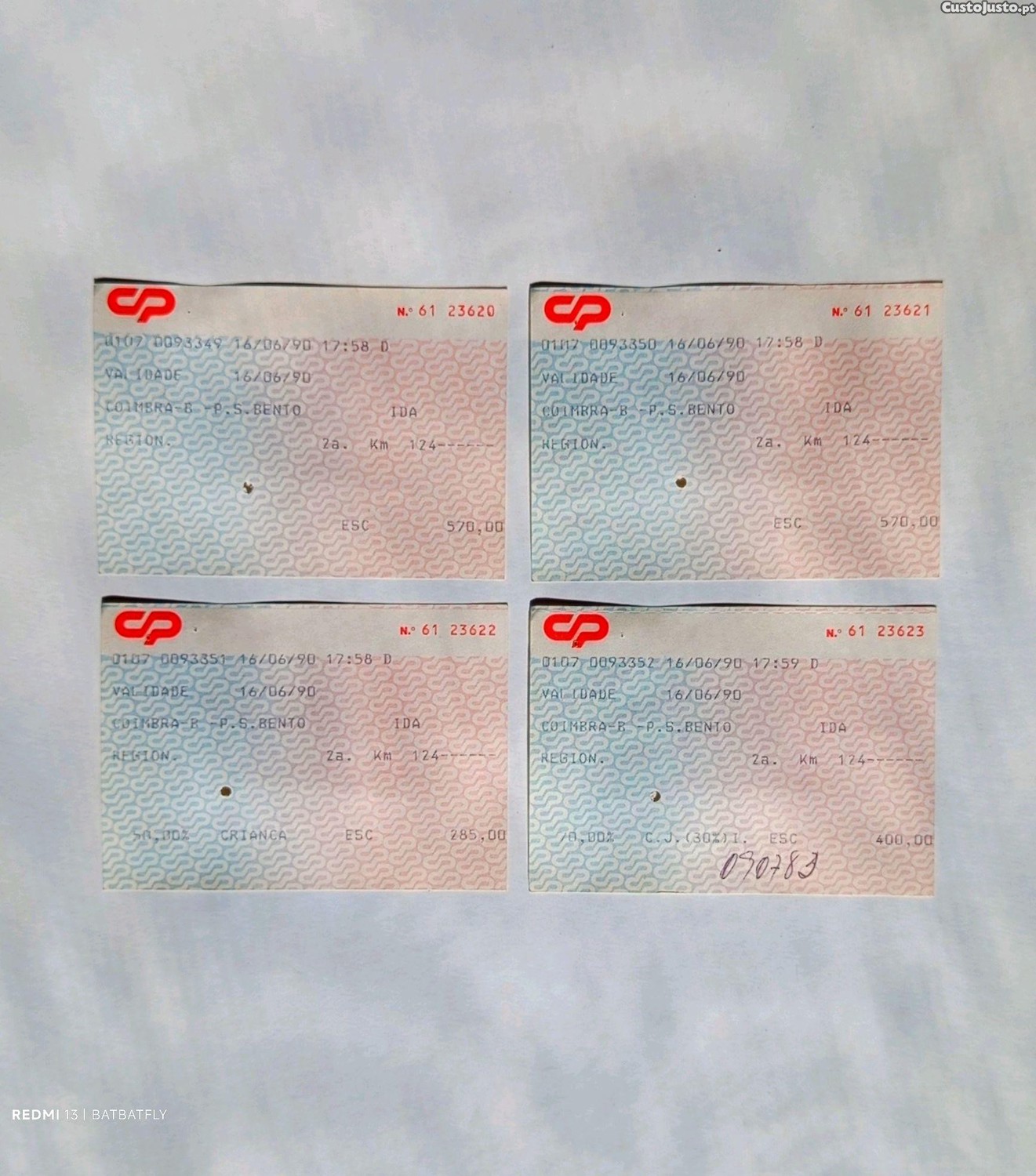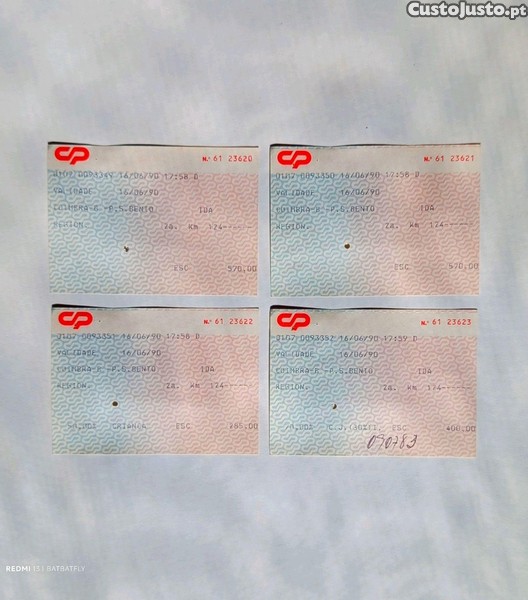 4 bilhetes de comboio Regional da CP entre Coimbra B - P. S. Bento, de 16/06/90, 2a classe de 570$00 escudos cada.