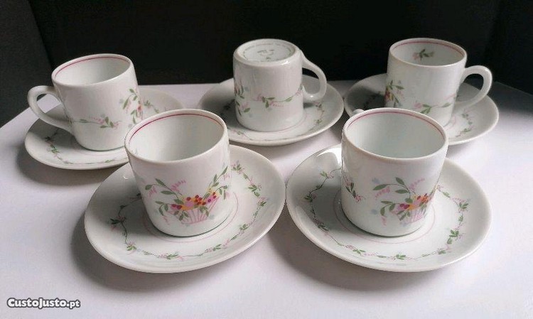 Preço: 25 €5 chávenas de café com pires em loiça Vista Alegre com bonito floreado em tons de verde e rosa