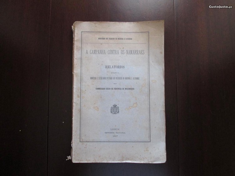Vendo livro "A Campanha contra os Namarraes", de 1897 do Ministério dos Negócios da Marinha e Ultramar - Relatórios Enviados ao Ministro e Secretário D'Estado dos Negócios da Marinha e Ultramar pelo Comissário Régio da Província de Moçambique, editado pela Imprensa Nacional, com 176 páginas e estado razoável.