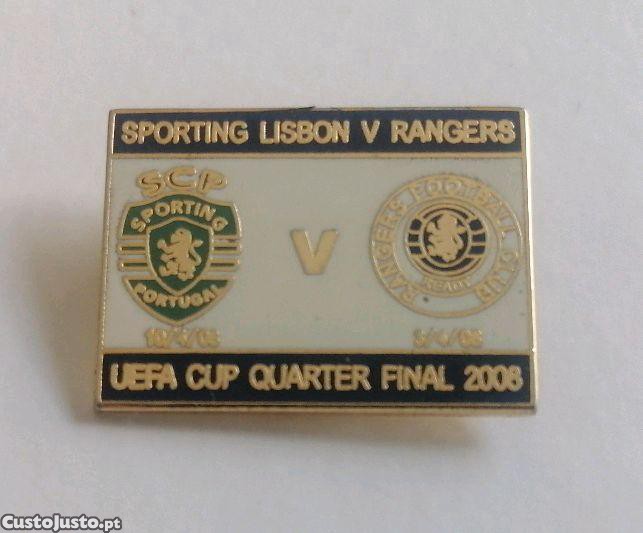 Preço: 25 €Alfinete de lapela alusivo ao jogo do Sporting V Rangers nos quartos de final da taça UEFA de 2008