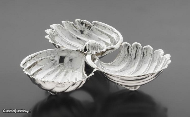 ANELEIRA EM PRATA PORTUGUESA 833 SÉC. XX - Aneleira em forma de 3 conchas unidas decoradas com búzio. Pés em forma de caramujos. Peso: 47,6 g. Dim: 3x12x12 cm. Com marcas de contraste em vigor de 1938 a 1984