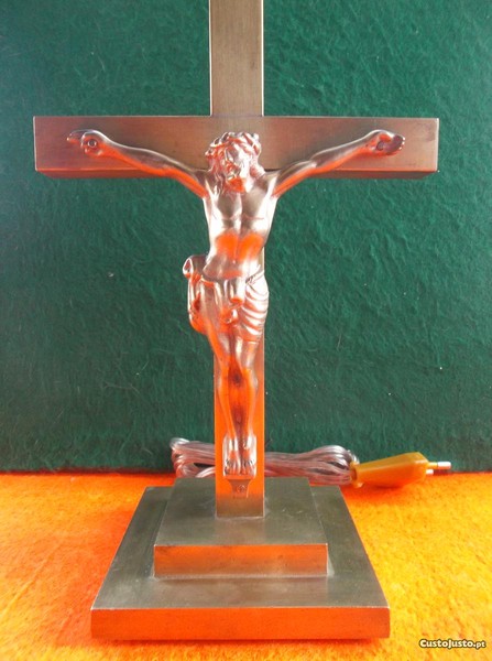 Candeeiro crucifixo antigo em latão com a imagem de Cristo . Altura com abajur 38 cm largura da cruz 15 cm . Está a funcionar inclui a lâmpada e abajur . Inclui portes em correio registado .