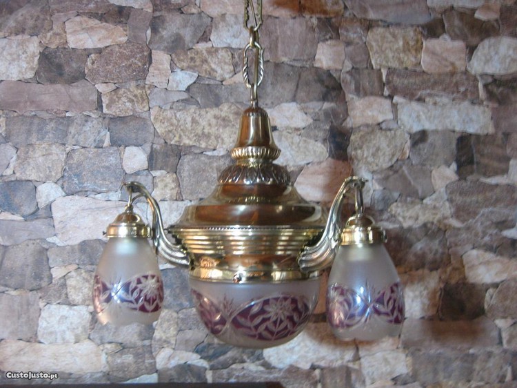 Antigo candeeiro teto art deco em latão com plafon central e 3 tulipas de vidro facetado 1930s