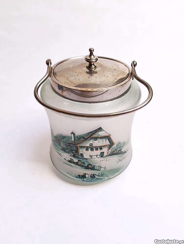 Antigo Frasco Boleira em Vidro Fosco, com pintura assinada com motivos campestres, com Pega e tampa em Metal. Recipiente muito usado pelas famílias inglesas no início do séc. XX, para guardar biscoitos, Bombons, etc.