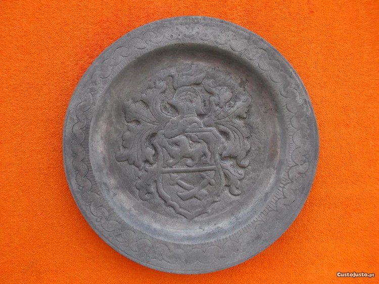 Vendo prato decorativo antigo em estanho com armorial , dimensões 21 cm pesa 700 gramas . Inclui portes em correio normal .