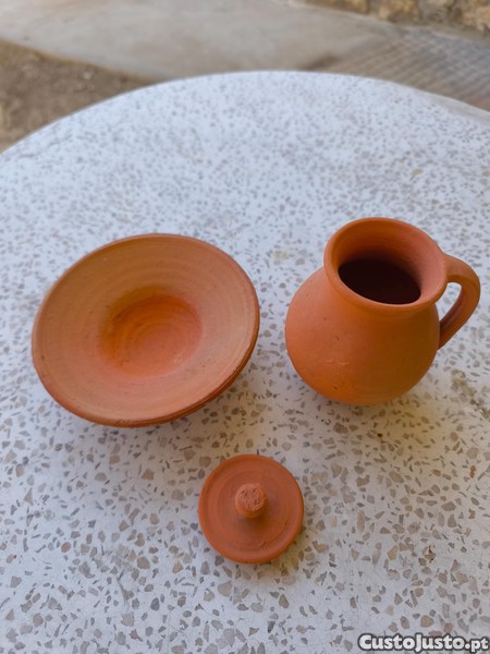 Antigo púcaro em barro, artesanal, com tampa e prato para apoio, dos anos 80, em perfeitas condições