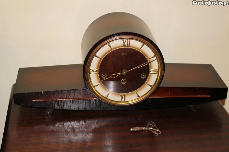 Relógio de mesa ou lareira com caixa de madeira, mostrador creme e dourado. É de 3 cordas. A chave incluída