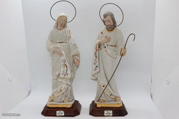 Arte sacra - Maria e José em porcelana pasta de Limoges com aplicações de cristais de Áustria e dourado a ouro fino. Base em madeira envernizada. GRANDES 30 cm